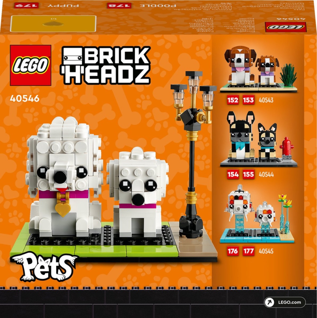 Maak jonge hondenliefhebbers blij met de LEGO® BrickHeadz™ Poedel (40546) set. Deze bouwbare set bevat twee schattige witte poedels met roze halsbanden, waaronder een met een hartje. Met een hoogte van ca. 8 cm en een stevige bouwplaat naast een vintage straatlantaarn, is het een perfect cadeau voor kinderen vanaf 8 jaar en BrickHeadz verzamelaars.