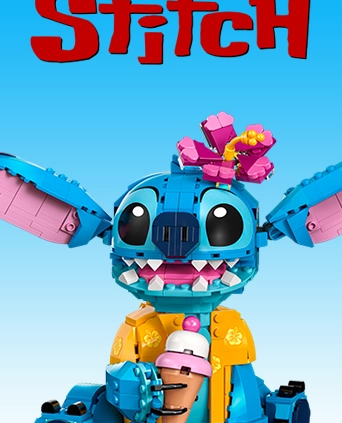 - Stitch (set 43249) – Build a detailed Stitch complete with Hawaiian shirt, ice cream and flower. His adjustable head and rotating ears make this model come to life.
